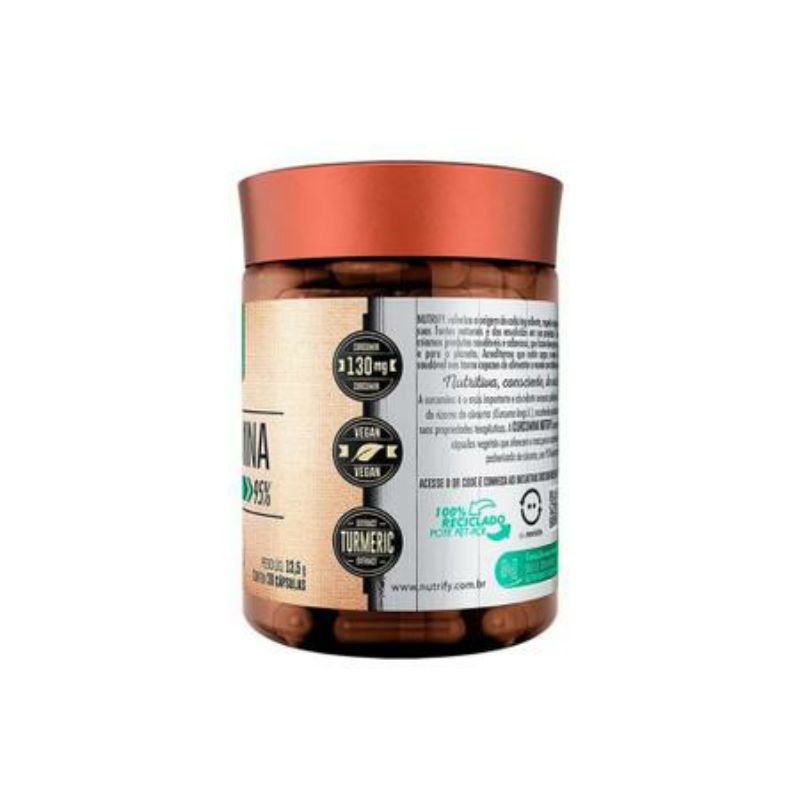 Curcumina Nutrify possui alta pureza e concentração do extrato padronizado de cúrcuma: 95% de curcuminóides, o que aumenta sua ação terapêutica. Fornece 130 mg de curcumina em 1 cápsula. Além de matéria-prima e cápsulas de origem vegetal, sendo apta para consumo do público vegano.